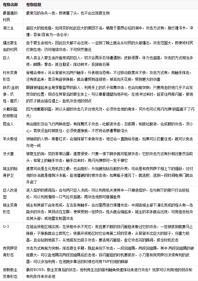 来到一处院落被村民困在里面,村民还从石洞里引出一名巨人,接下来是与巨人的单挑,如果之前曾救过那只被兽夹困住的白狗,这时它会现身帮忙,战斗中会吸引巨人的一部分注意力。用枪朝巨人射击,积累到一定伤害它会痛苦地蹲下身躲,背后钻出寄生虫,这时要按屏幕提示的按键操作,跳到巨人的背部用匕首攻击寄生虫,如此砍杀寄生虫3次便可将巨人击倒。
