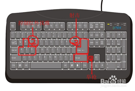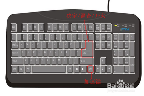 这里主要是介绍键盘操作方法。你需要准备张标准101键盘。如下图所示,没有必要去购买专门的游戏键盘的,那样太奢了。下图右边显示的是各个键盘的默认设置。