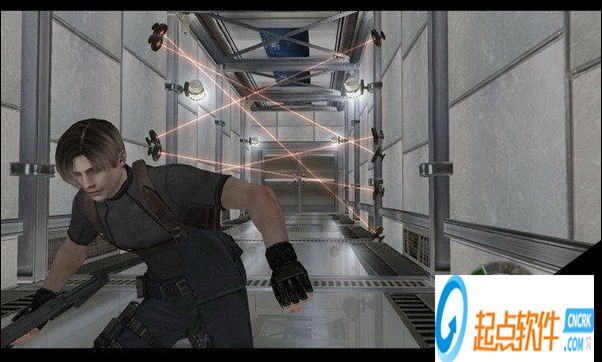 往前下梯子出门,走廊上有多道红外线机关,按照屏幕提示的按键来操作躲避,开门后又是红外线的反扑,躲过去后红外线消失,穿过大厅由后面的升降机下去。