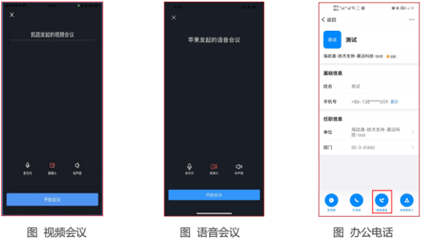 入口一:消息界面点击视频电话图标,选择[视频会议]或[语音会议]进入会议,点击[开始会议],从通讯录选择参会人员,点击确认即可发起视频会议/语音会议。