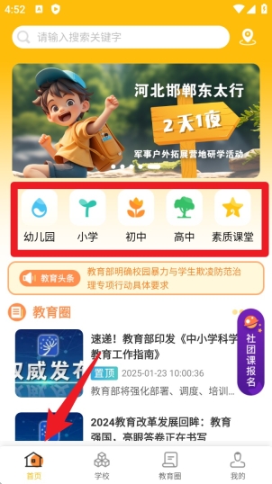 1. 进入App首页,首页顶部设有搜索栏以及活动轮播图,在其下方能够点击“幼儿园”“小学”等分类,实现快速跳转至相应内容。