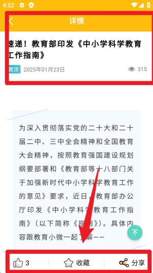 2. 点击教育圈中的资讯卡片,进入详情页可查看完整政策内容,也能点赞、收藏或分享文章。