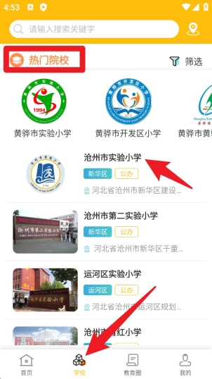 3. 进入“学校”页面后,可浏览热门院校列表,点击学校名称查看详情和具体办学信息。