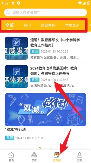 4. 在教育圈页面,你能够切换“全部”“家庭教育”“本地资讯”等栏目,从而快速筛选出你所关心的教育话题。