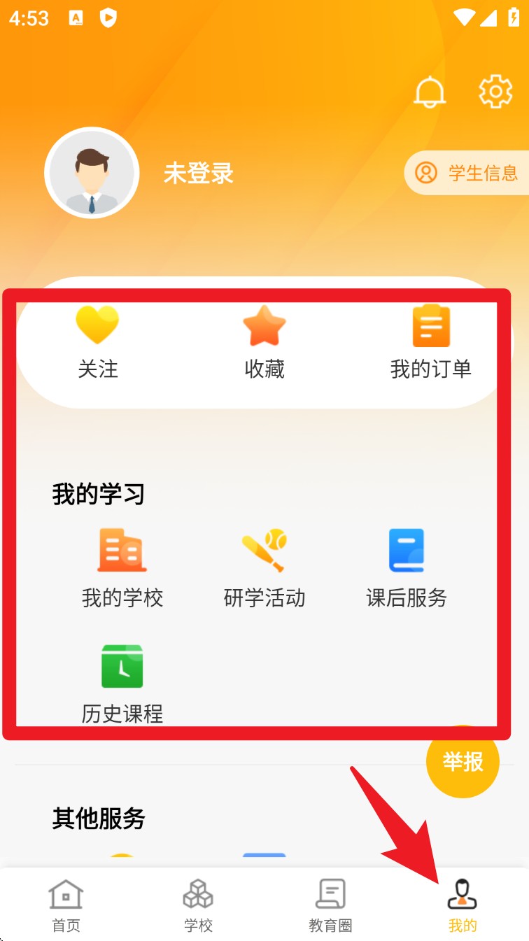 5. 点击底部“我的”页签,能查看已关注、收藏、订单记录,并进入“研学活动”“课后服务”等功能区。
