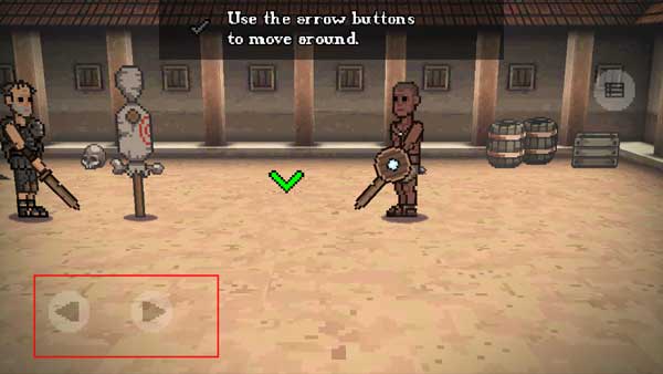 2、紧接着便是新手引导,第一步是通过左边的左右按钮操控角色移动,待玩家抵达绿色指示箭头所处位置时,开启下一步。