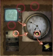 3、把获取到的“纽扣”与“铁条”安装在电视机上,此时电视接收到信号,从日记里获取线索,依据线索转动频道来切换电视中的图案(逆时针转3下 - 皮影、顺时针转7下 - 酒壶、逆时针转5下 - 锣、顺时针转6下 - 伞、你转1下 - 铃铛)