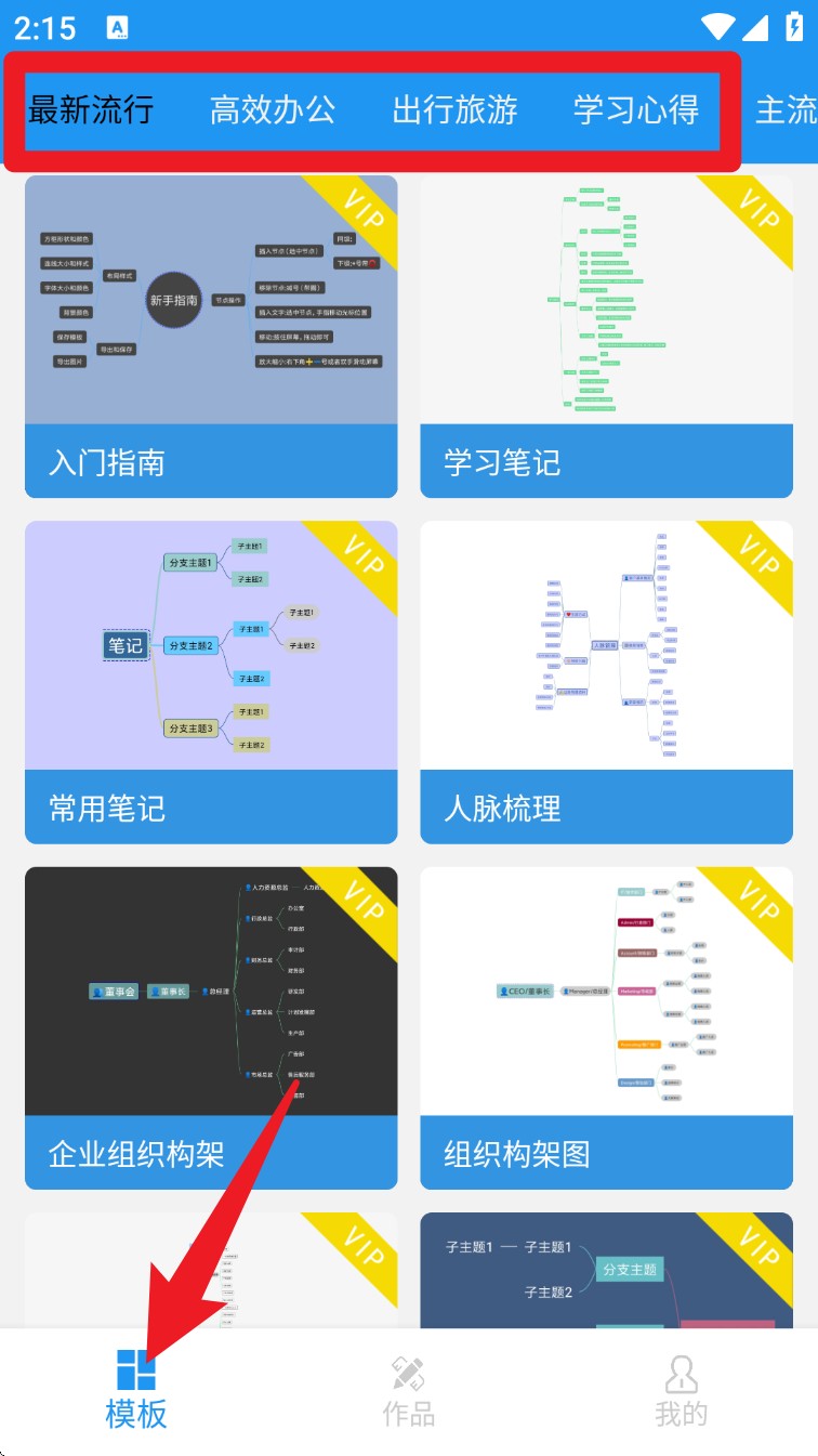 1. 打开App,点击底部的「模板」,就能浏览诸如高效办公、出行旅游、学习心得等不同的导图分类。
