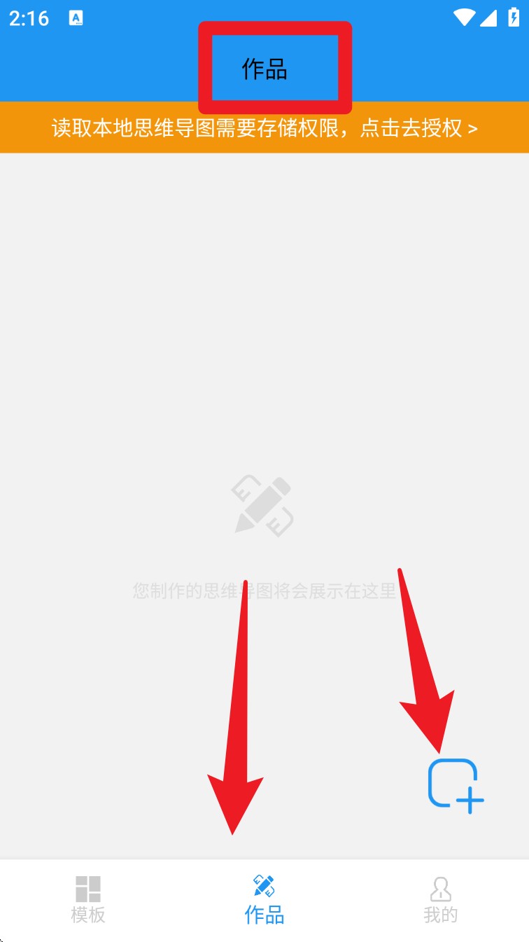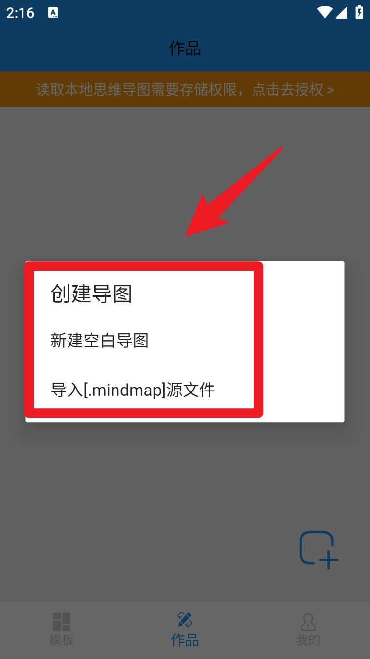 3. 切换至底部「作品」页面,点击右下角的“+”号按钮,即可新增导图内容。