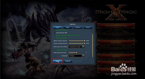 4、在设置界面点击【Apply】,之后退出游戏并重启游戏,如图所示: