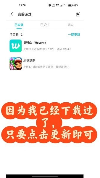 打开qooapp后,在“我的游戏”下面有个“已安装”,找到weverse,点击“一键更新”;