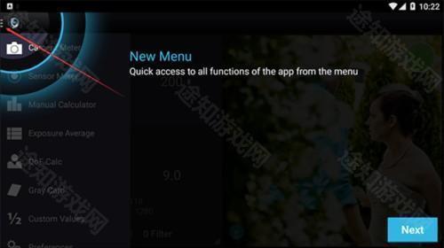 1. 开启lightmeter,点击左上角的按钮,即可调出菜单栏,从而能快速访问应用程序的全部功能。