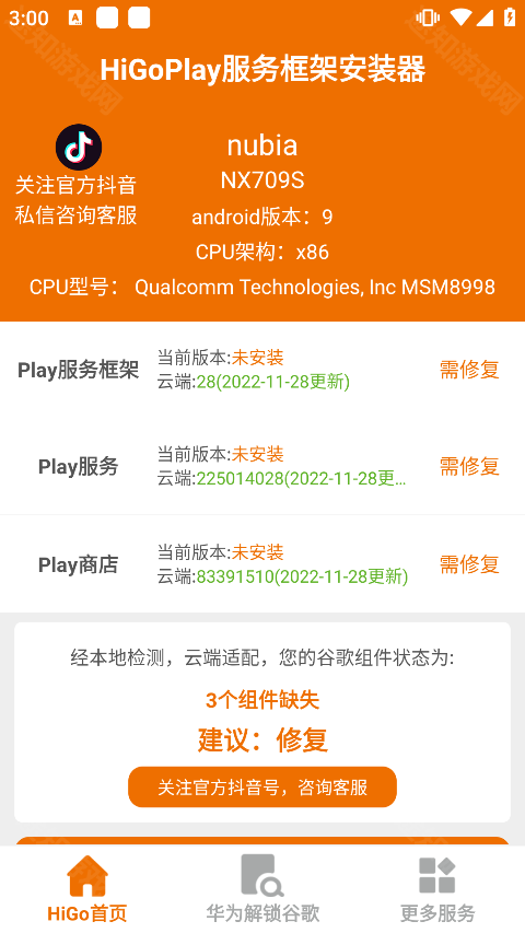 1. 安装完成后打开软件,进入首页便能看到自身手机信息。如下方图片所示,小编的设备服务、商店以及服务框架这三项工具均未安装,需进行修复。