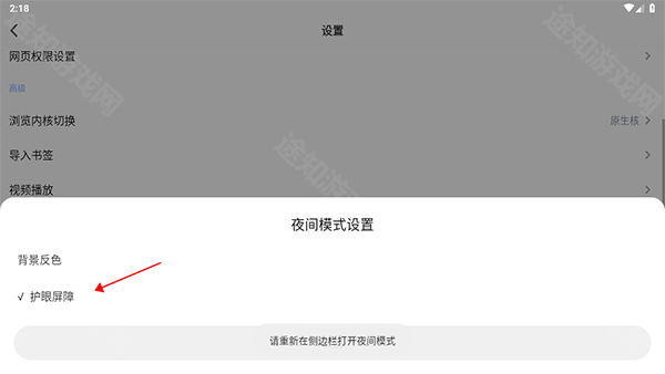 3、在设置里,我们要点击夜间模式设置,然后点击右侧的背景反色功能。
