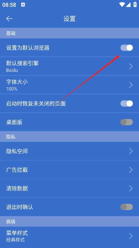 4. 在设置界面,你不仅能够将软件设为默认浏览方式,还能够切换搜索引擎。