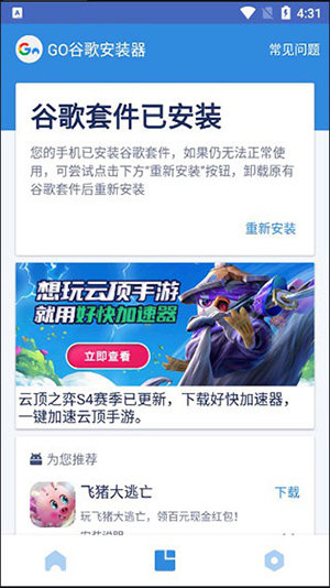 1. 一键轻松安装应用,安装过程中,能卸载此前无法使用的谷歌服务并重新安装。卸载功能会帮大家清理游戏里的谷歌插件。