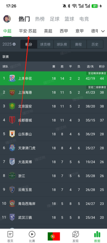 3、只需点击上方的联赛按钮,就能看到你想看的联赛排行榜啦。
