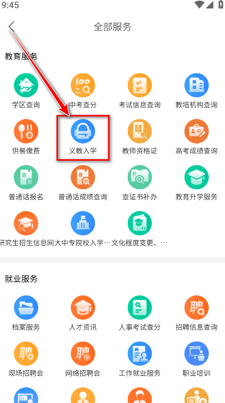 首先,在App顶部的搜索栏中输入“义教”,随后即可进入【义教报名】界面。