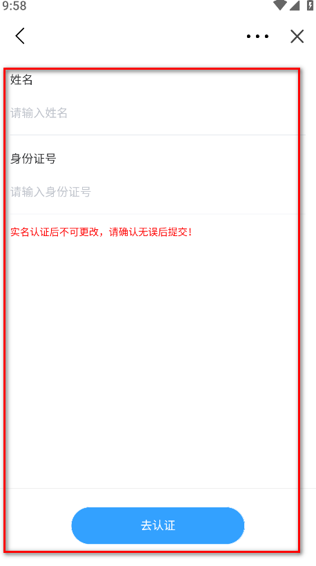 3. 请输入个人姓名及身份证号码,随后点击“去认证”即可。需留意,实名认证一旦完成便无法更改,务必确认信息准确无误后再进行提交。
