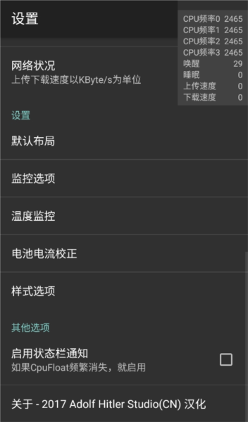 CpuFloat是一款由酷安开发者打造的系统辅助软件。该软件经酷安平台大神汉化后,实用性极高,能出色地实时监测系统设备,操作也极为简便。它可对CPU频率、温度,GPU频率、负载(未标准化)及温度进行监控,还能展示唤醒和深度睡眠时间、电池电流与温度、网络速度等。让监测所得数据以你心仪或所需的形式呈现出来。
