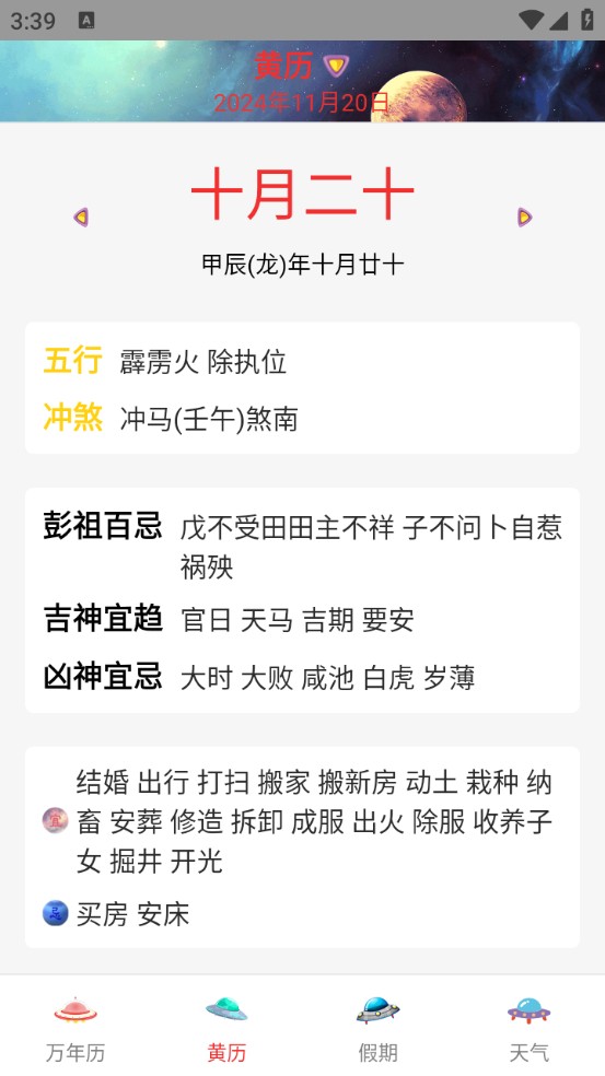 3、黄历页面主要提供了良辰吉日,可以进行参考。