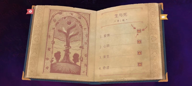 1、首先,玩家进入游戏后,会进入第一章“生与死”,这一章又被划分成多个小节。当界面旁的方框内出现皇冠时,就表示该小节已通关成功。