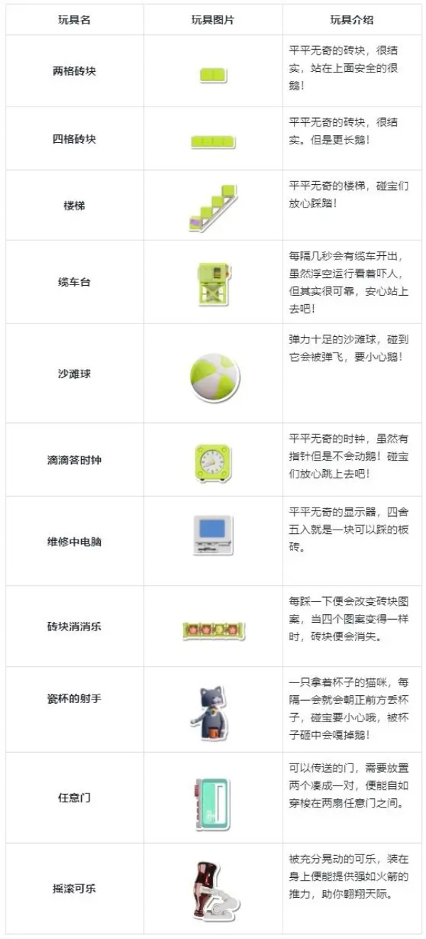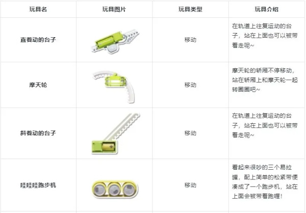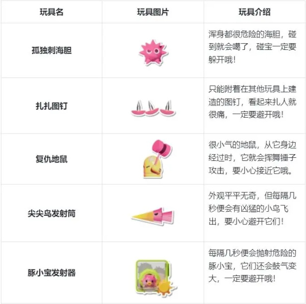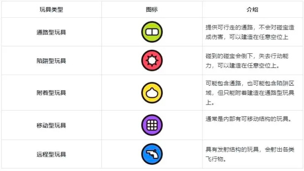 我们把这些玩具划分成了五种类型,分别是通路类、陷阱类、附着类、移动类和远程类。接下来请大家查看下方的图片说明哦!