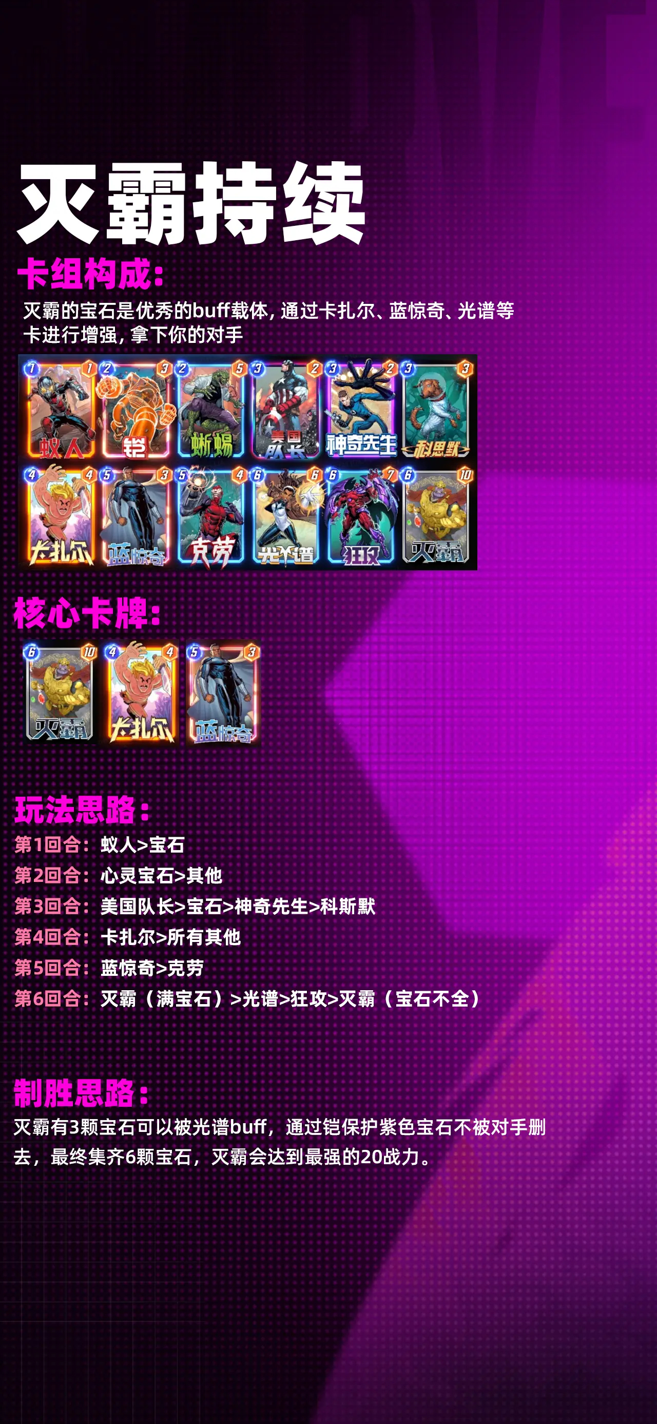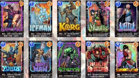 优势:开局用低费卡牌平稳过渡,之后借助She-Hulk这类高费卡牌构建强势战力压制局面。这种卡组搭配要求玩家把握恰当的时机打出高费卡牌,一旦操作到位就能对敌方形成极大威慑。
