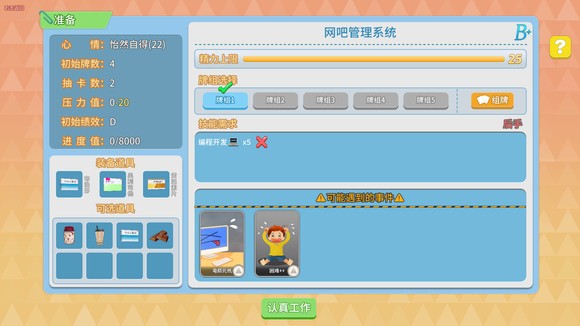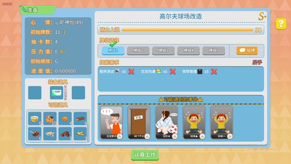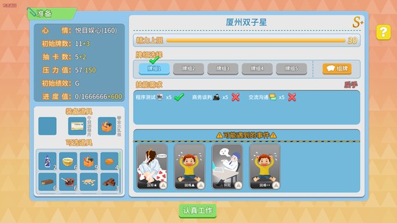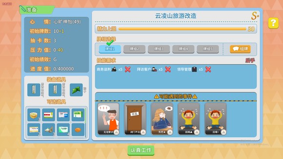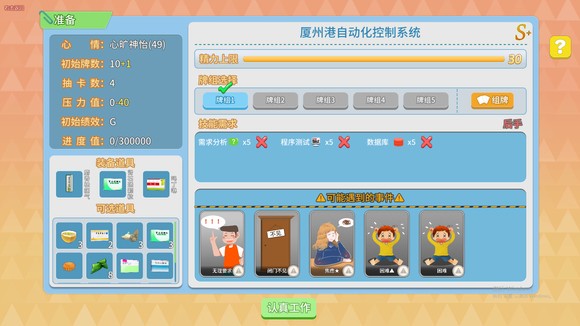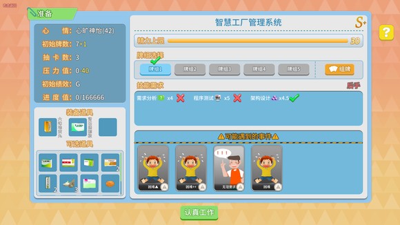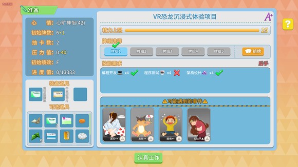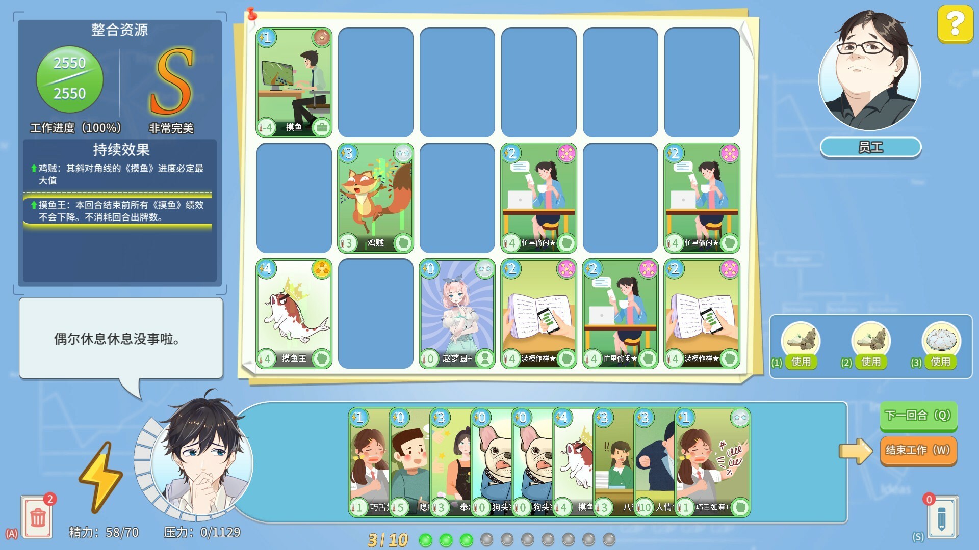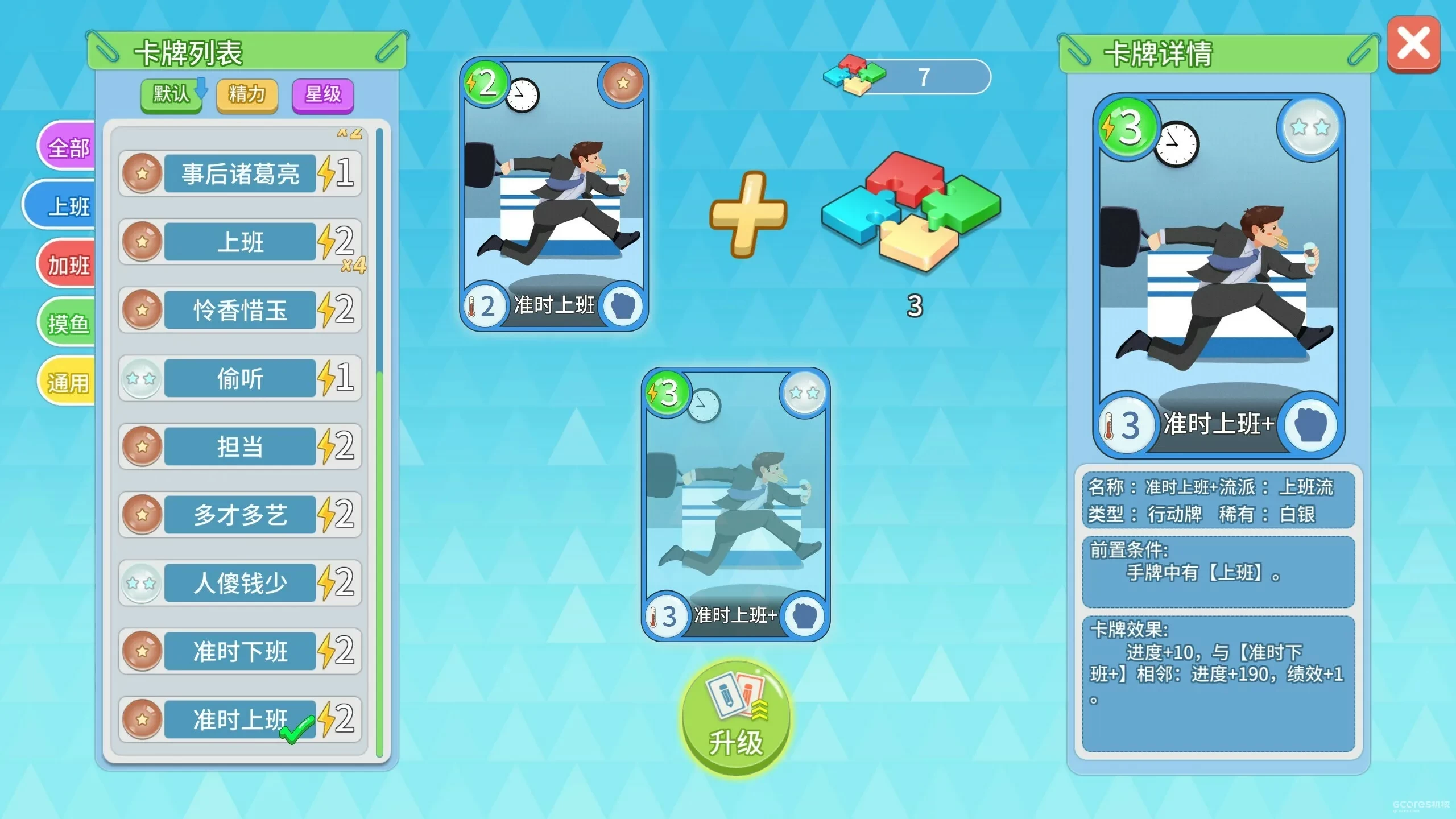 这背后的原因是卡牌系统中存在大量组合效果,例如“准时上班”这张卡要是和“准时下班”相邻打出,就能带来工作进度的大幅提升以及绩效的显著增加,不过这两张卡牌的使用都得先以手牌中有“上班”这张基础卡作为前提条件。