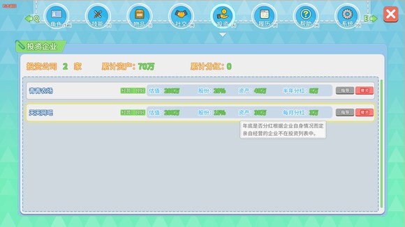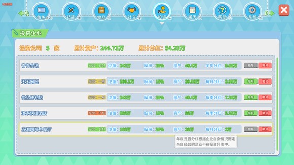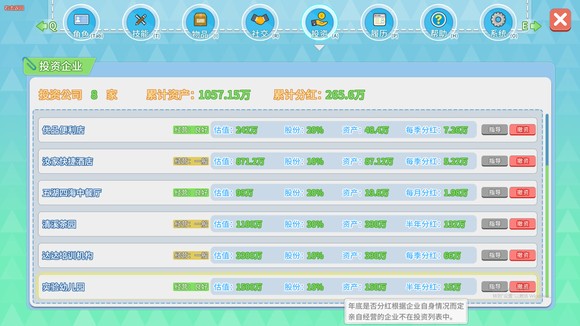 9/迪X尼游乐园,解锁条件是娱乐等级达到2级且需100万投资,也能花费300万直接跳过挑战环节,通关的斩杀线为240。这又是一家投入高但收益低的企业,每个季度仅能盈利20万,到了后期建议果断将其出售,希望能对相关设定进行调整。