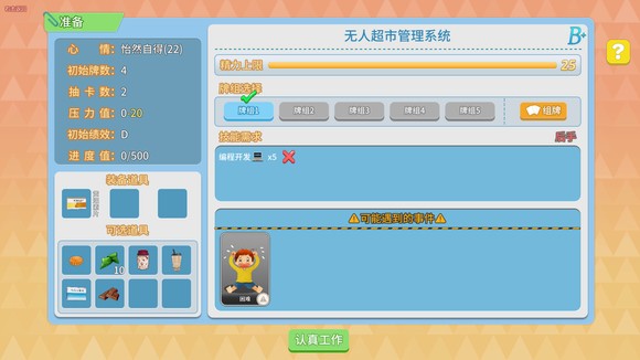 游戏的操作方式为出牌,每回合的抽牌数量和出牌次数与玩家的思维、执行等属性相关联;玩家最多可携带3件食物,这些食物能起到降低压力、推进进度、恢复精力的作用,其中最难得的是可以提升绩效。
