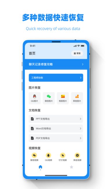 数据恢复工程师biu版是一款专业的手机数据恢复软件,主要用于微信相关数据的恢复,包括微信照片、微信视频、微信文件以及微信聊天记录等,并且提供1对1的工程师协助服务。该软件能够专业扫描手机中的所有照片或图片,涵盖相册照片、微信照片、QQ照片、钉钉照片以及缓存图片等多种类型,同时支持将这些内容导出;此外,它还可以扫描手机里的所有视频,像相册视频、微信视频、QQ视频、钉钉视频等都包含在内,同样支持导出操作。需要说明的是,软件会借助技术手段尽力帮助用户恢复数据,但数据仍有可能出现彻底丢失而无法找回的情况,最终能否完全恢复要以实际的检测结果为准。