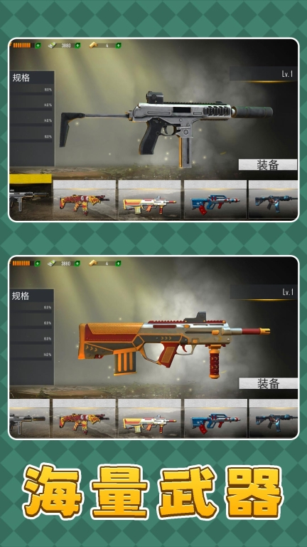 1游戏内收录了多种枪械类型,每款武器都具备专属特性,且部分武器拥有进阶强化形态;武器品质从基础款到高阶稀有款依次划分,不同等级的属性加成各有侧重,可适配各类作战场景。