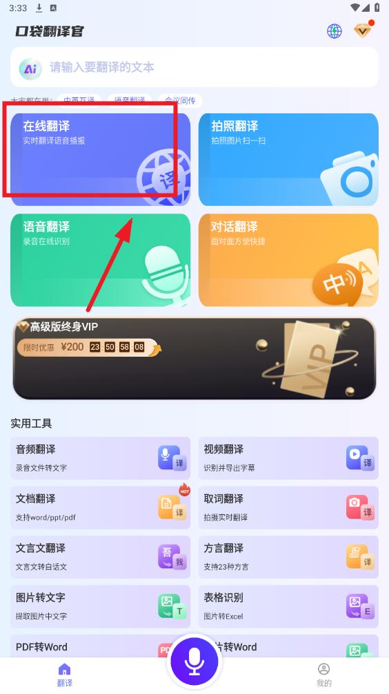 打开口袋翻译官应用,进入首页后挑选需要使用的功能,例如在线翻译