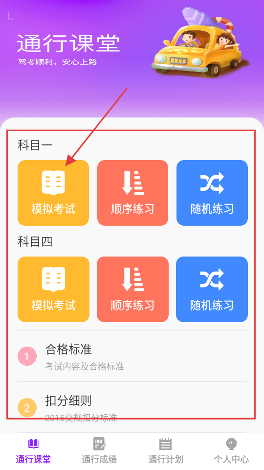 进入应用后,界面上有科目一、科目四对应的【模拟考试】【顺序练习】等功能选项,选择科目一的【模拟考试】,即可进入模拟考试准备页面。