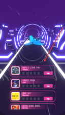 1、游戏初始的选歌界面,背景呈现为霓虹隧道与飞机的组合,界面中设有歌曲列表,点击对应歌曲旁的Play按钮,即可进入该歌曲对应的飞行关卡。