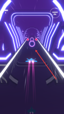 2进入关卡后,操控飞机在霓虹隧道中飞行,注意前方的紫色环形障碍,让飞机精准撞击这些圆环,以此推进游戏进程。