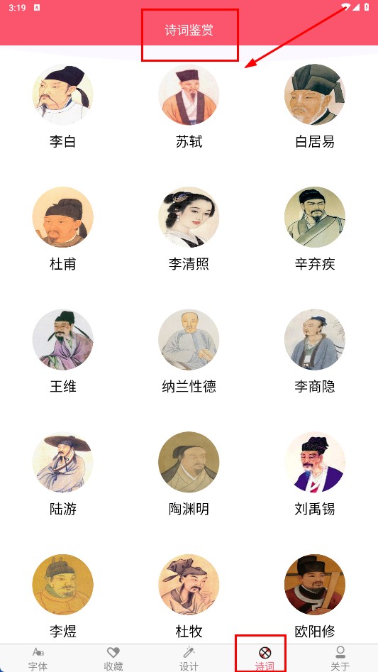 点击底部的【诗词】功能按钮,就能进入诗词鉴赏页面,在那里可以选择李白、苏轼等诗人,开展诗词鉴赏活动。