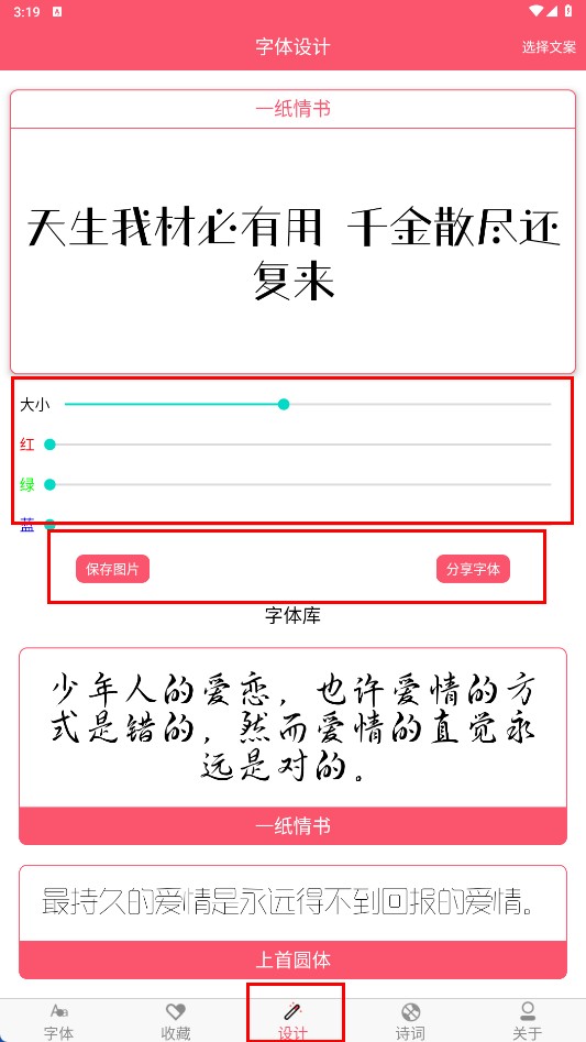 点击底部的【设计-功能按钮】,即可进入字体设计界面。在这里,你能够对字体的大小、颜色等参数进行调整,完成设计后还可以保存生成的图片,或者将设计好的字体分享出去。