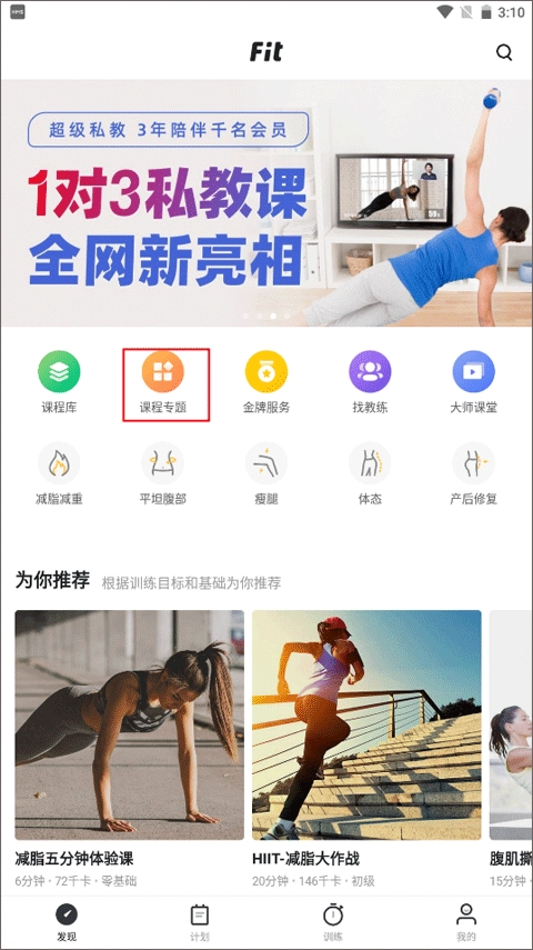 打开软件后进入主界面的【发现】板块,在该界面中,你能够看到课程库、课程专题、金牌服务、找教练等功能选项,接着点击“课程专题”。