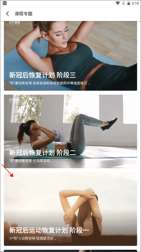 进入课程专题页面后,你能看到最新的新冠后恢复计划的三个阶段,建议先从第一个阶段着手训练。