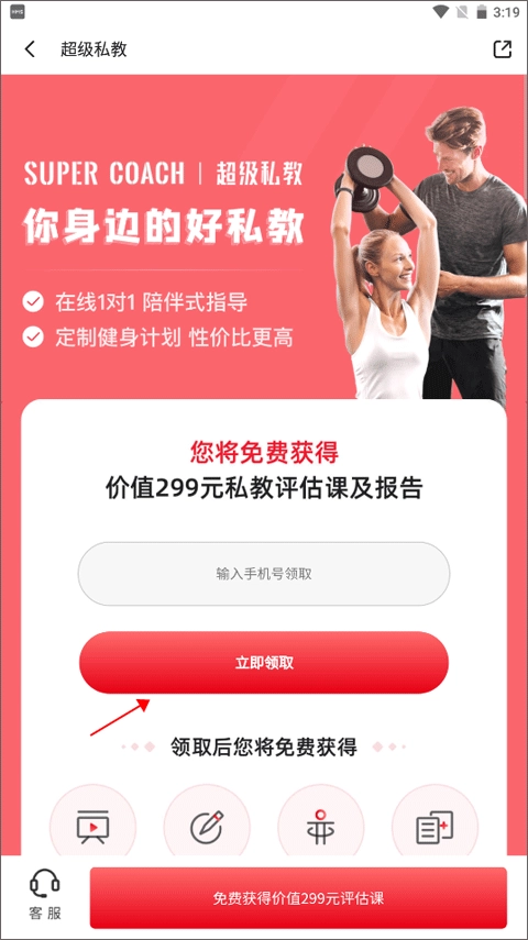 这时页面会自动跳转至课程领取页面,只需填写你的手机号码,接着点击“立即领取”按钮,就能免费获取价值不菲的评估课程,还有专业教练为你指导相关训练内容。