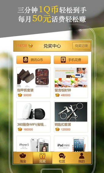 3分钟1Q币轻松到手,花钱充QQ会员的都弱爆了;每月50元话费轻松赚,妈妈再也不用担心我的手机停机了!淘金大厅:试玩精品游戏,体验炫酷应用,赚取金豆奖励。