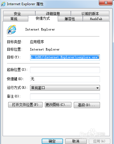 9.快捷方式→目标→删除双引号后面的劫持网址(可能会变,但是再变也会打开2345流氓主页引导)→确定。