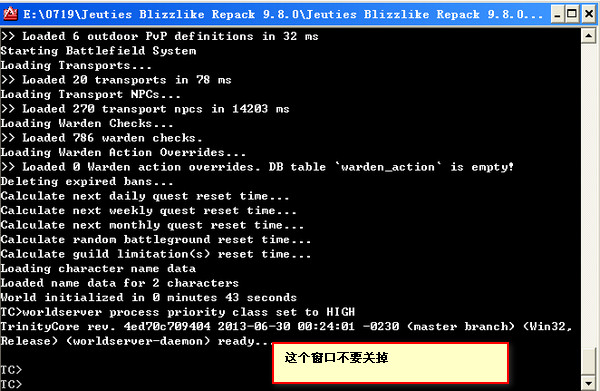 4.点击最上面的start the world server启动服务器,这时候会弹出一个dos窗口在不停的跳动数据,稍等一会就会完成,完成后dos窗口也不要关掉