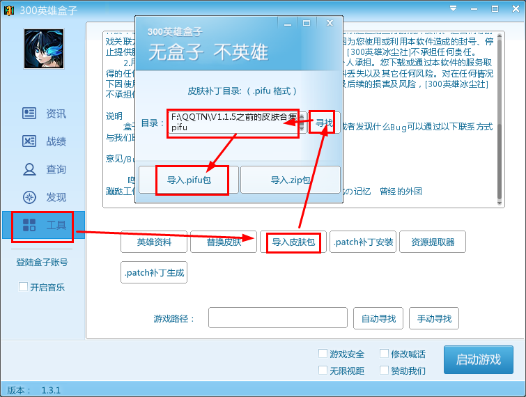 1.打开300英雄盒子2.“300英雄盒子”——工具——导入皮肤包——寻找 300英雄盒子皮肤包(下载后解压)“.pifu文件”——导入.pifu包(如下图)