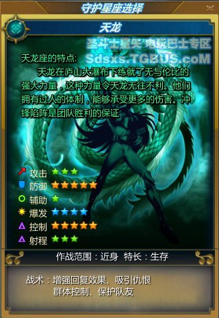 天龙座是一个队伍的核心,在副本或者野外与BOSS战斗时,需要依靠高防御的天龙座吸引BOSS的仇恨,承受BOSS的伤害保护其他队伍成员不受怪物攻击。
