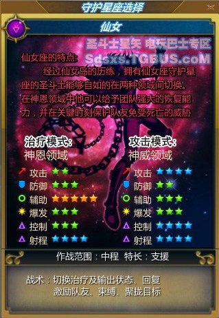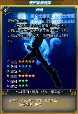 星座守护可以理解为传统游戏中的“职业”。游戏中共有五大星座守护,即我们所熟悉的青铜五小强的星座守护。每个星座守护都有自身的定位,查看下面的人物卡片: