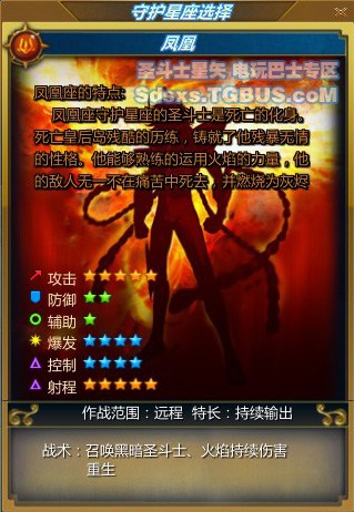 在死亡皇后岛,经过地狱式的训练而走出来的凤凰座,有着不死鸟的称号,他是所有青铜圣斗士中拥有最强的单体控制力的角色,能熟练的运用灼烧能力进行攻击,也可通过自身的提升从而拥有小幅度的瞬间爆发力。与白鸟座的AOE技能不同的是,凤凰座的AOE技能没有附加的冰冻减速以及控制效果,是单纯的AOE伤害输出技能,这也使得凤凰座是青铜圣斗士中拥有最强群体攻击能力的职业。