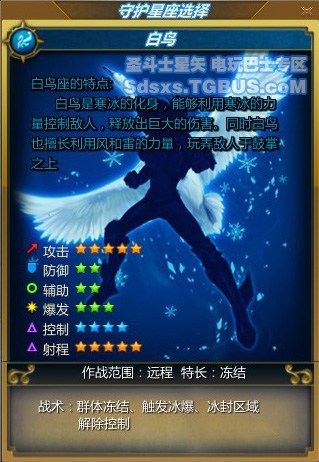 擅长远距离发起攻击,白鸟座依靠释放的冻气对远处的目标进行攻击,甚至可以将敌人冰封在原地。